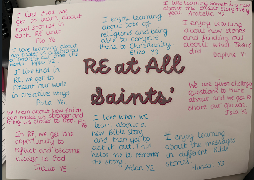 Children stated that they love RE and are ‘proud to be Curriculum Champions for All Saints’ as they feel that it is a spiritual school and that Jesus/God are all around us as we let our light shine.’